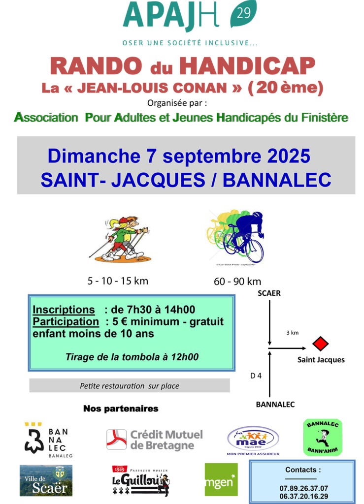 L’APAJH du Finistère organise la 20ème édition de la Rando du Handicap Dimanche 7 septembre à Saint Jacques en Bannalec au profit des personnes en situation de Handicap accompagnées par les Groupement APAJH 22-29-35 sur le département du Finistère.