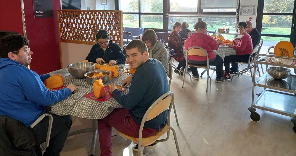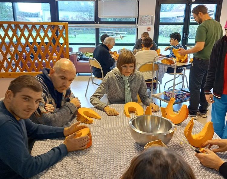 Les personnes accompagnées par l’accueil de jour, elles-mêmes concernées par la coupure d’électricité, ont investi la grand salle du Foyer de Vie Résidence Rumain pour éplucher les potirons!
